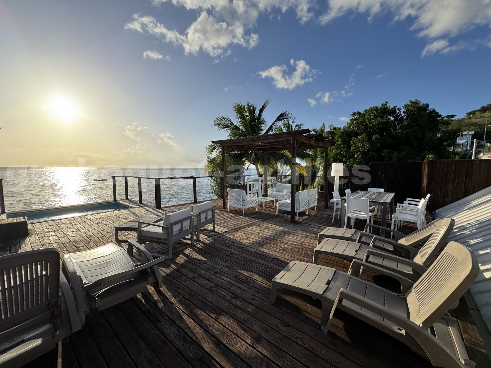 Profitez de deux terrasses : l’une à l’entrée de la maison, l’autre offrant un accès direct à la mer avec une vue dégagée et relaxante. Pour vos moments de convivialité, un rooftop aménagé avec bac à punch vous séduira par sa vue panoramique exceptionnelle sur la mer.