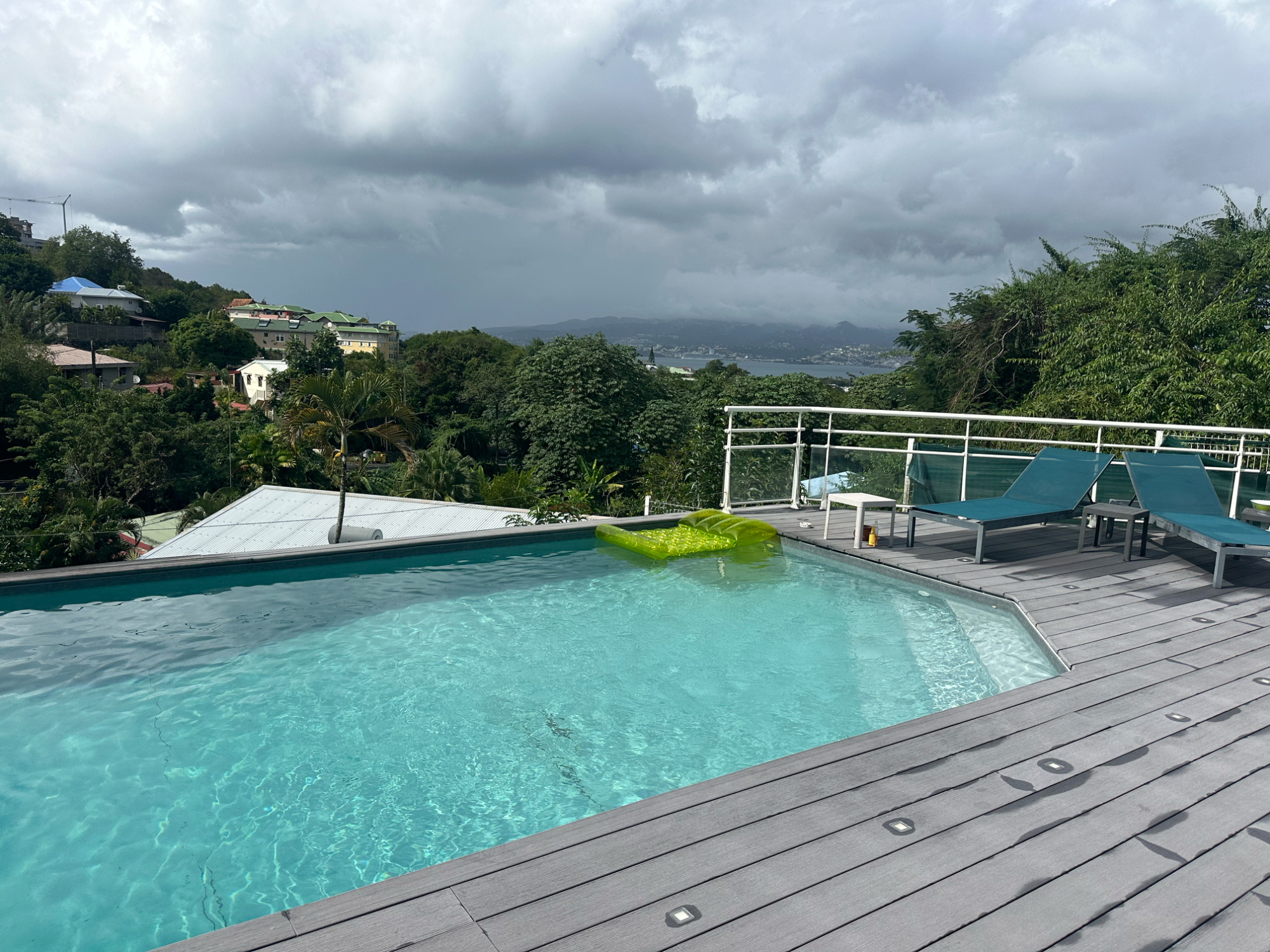 À l’extérieur, les terrasses, la piscine avec vue mer et le carbet traditionnel offrent un cadre parfait pour profiter d’un environnement tropical privilégié.
