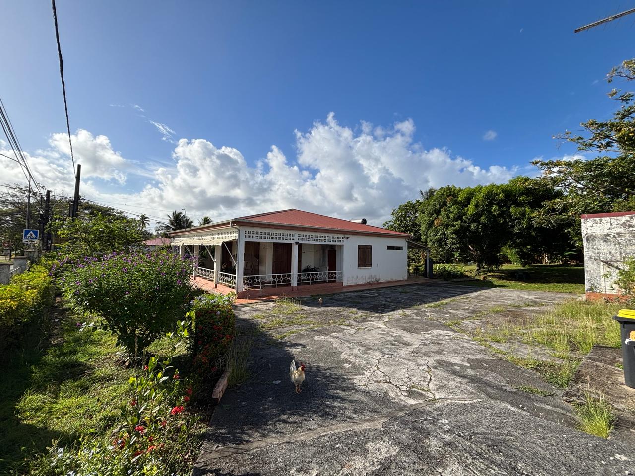 La maison de plain-pied d'une surface totale construite de 222 m² dispose d'une véranda couverte avec balustrade ouvragée et bénéficie d'un cadre de verdure remarquable avec de beaux arbres fruitiers matures (manguiers, bananiers et autres espèces tropicales).