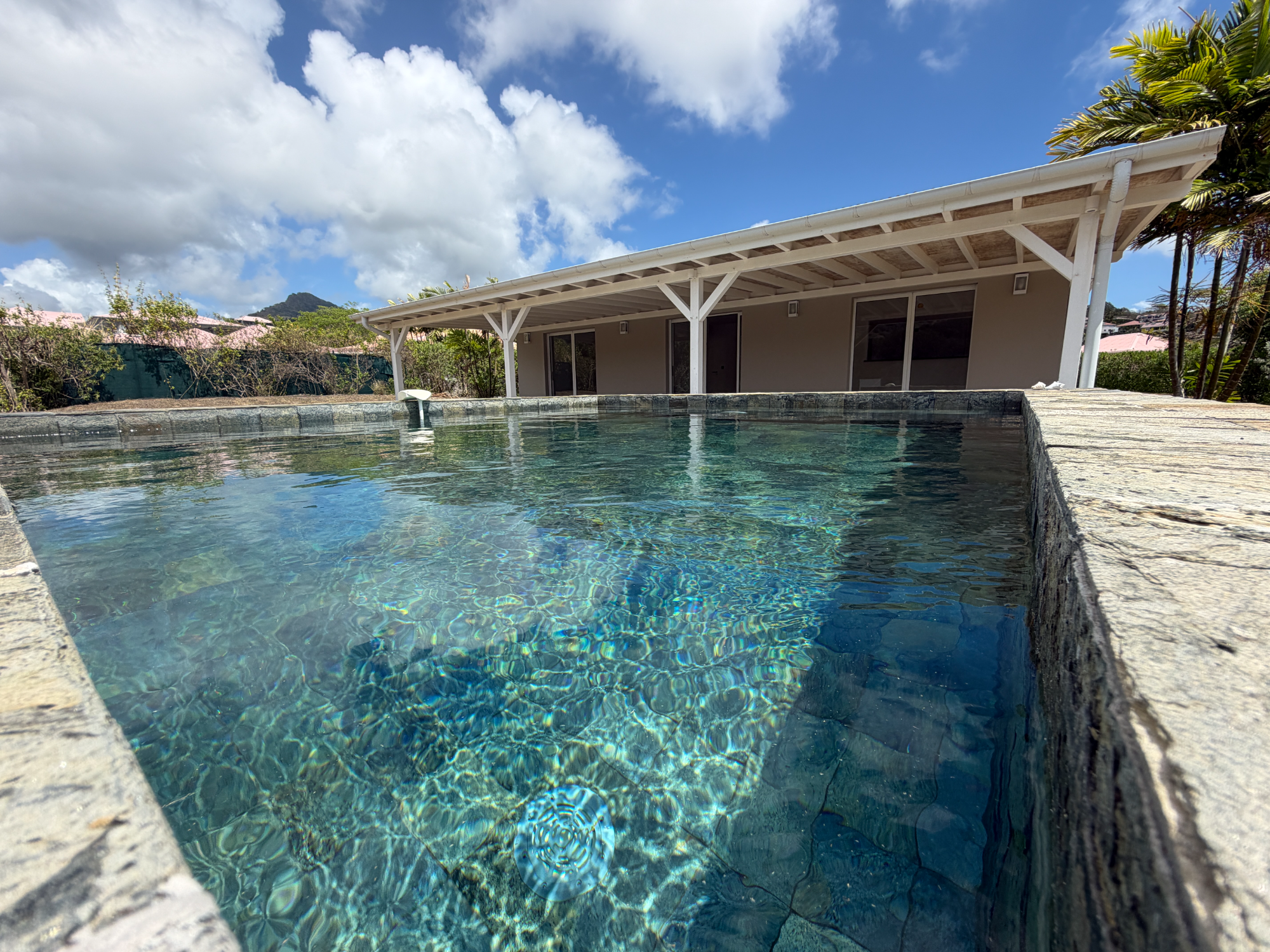 Véritable atout de la propriété, l'espace véranda, plage piscine en deck de 75 m² s'étire avec élégance autour d'une piscine extérieure de 15 m² habillée de pierre de Bali, pour une atmosphère zen et authentique digne des plus beaux resorts.